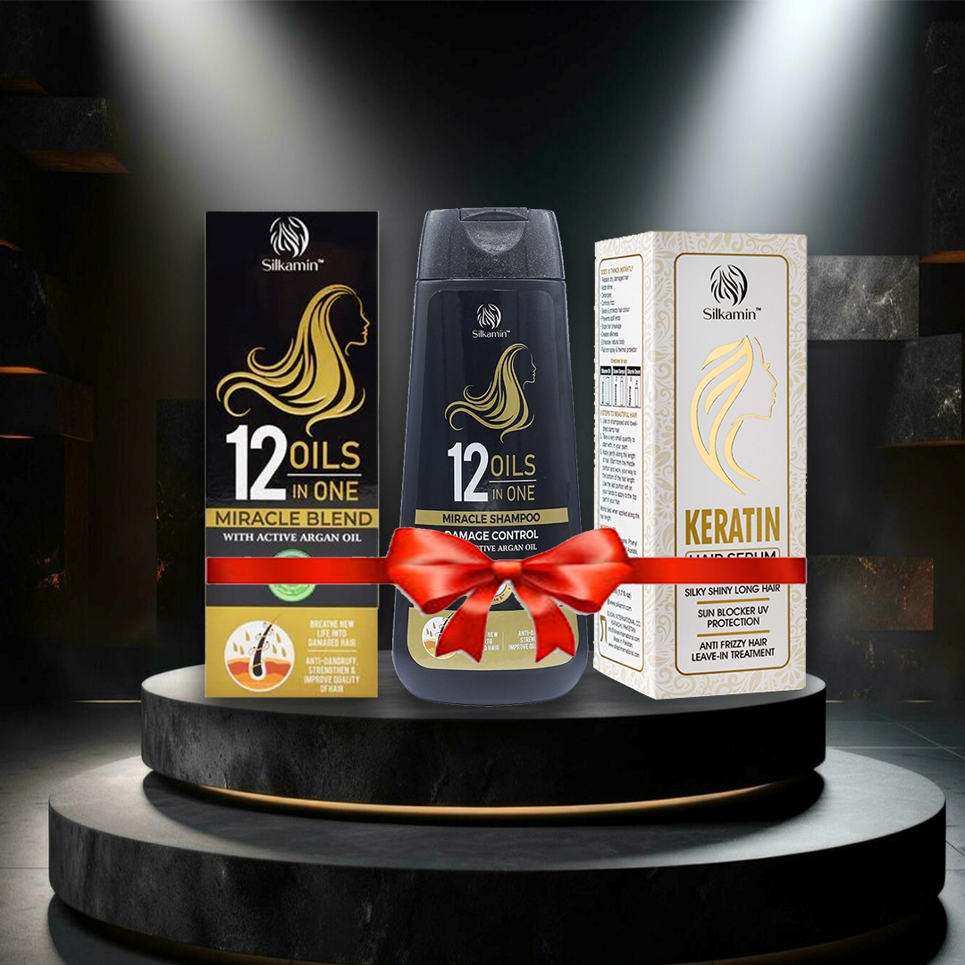 Introducing 12 Oils in 1 Miracle Blend Oil + Shampoo + Keratin Serum–the all-in-one solution for a nourished scalp and healthy, lustrous hair. Our revolutionary blend of 12 enriching oils, plus a gentle shampoo and keratin serum, provides superior hydration and strengthening benefits. With regular use, hair is left feeling softer, more manageable, and with enhanced shine.